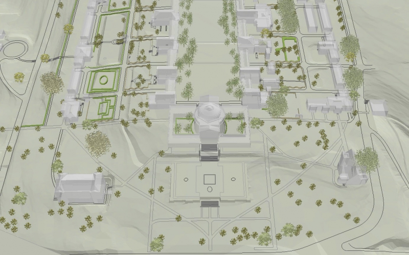 1914 campus modeling by UVA interns based on documentary evidence and plans by Heritage Landscapes