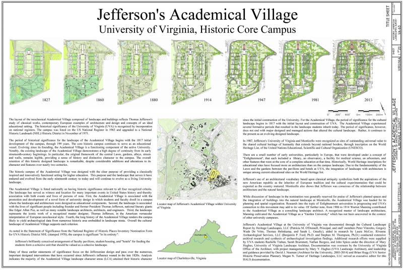 This analytical report documents the intricate spaces that comprise the historic core of the University of Virginia, affirming integrity despite nearly continual change and adaptation as a functioning component of an active campus, informing future Academical Village preservation and compatible change into the future. The research findings and synthesis provide a rich source of information, and reference into the future, to honor the landscape legacy of the University of Virginia and to inform the ongoing stewardship of the Academical Village landscape. The HALS documents provide the detailed history, evolution and current landscape records for wide public access through the Library of Congress.