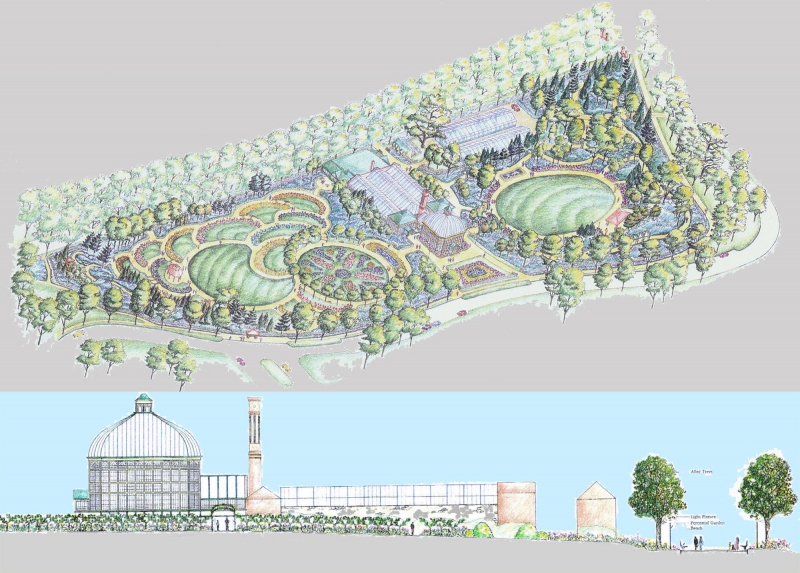 Hand drawn axonometric and elevation of the Druid Hill Park Conservatory complex as envisioned, construction and interior exhibits on the expanded Conservatory were completed in 2004