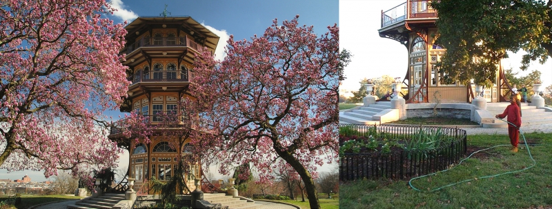 Laid out and replanted based on historic photos, Patterson Park Pagoda landscape fits the exotic structure, courtesy Friends of Patterson Park