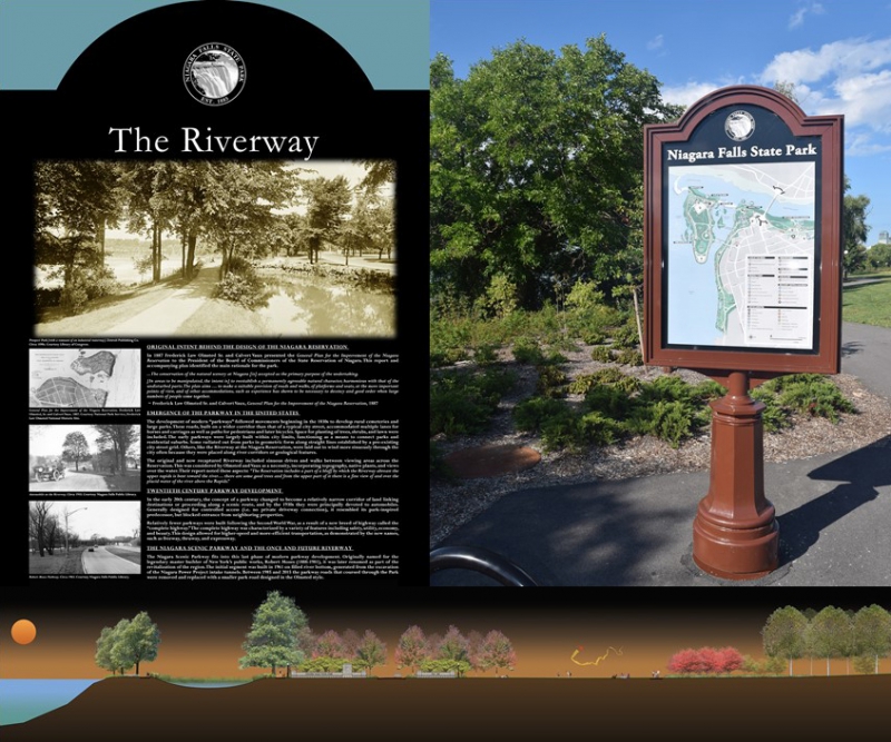 Heritage Landscapes authored the landscape components of the design reporting and developed construction documents for the redesign of the Riverway at Niagara Falls State Park. Originally laid out by Olmsted and Vaux as a narrow scenic drive, this project removed the 1960s highway interchange and road that severed park and river from the neighborhood allowing only through traffic. As the project landscape architect, we drew on the Olmsted Vaux 1887 design approach to shape a scenic park on fill along the Niagara River and Rapids, with a path network at accessible grades, a pond, layby parking and informative signs for daily community enjoyment and tourist use. Heritage Landscapes work included: