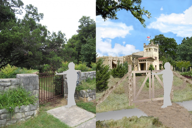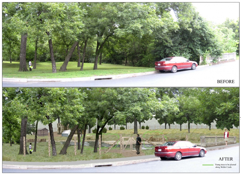 Proposed view of open landscape to Waller Creek for scenery and flood mitigationwith Texas prairie, wire fences and outbuildings restored to Formosa