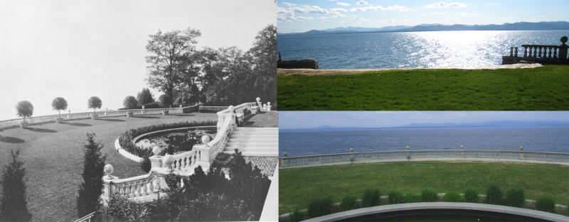 Historic view shows the 1920s balustrade and pool, above lake cliff failure took a portion out, restored in 2016, by building up from bedrock to stabilize the slope, courtesy Shelburne Farms