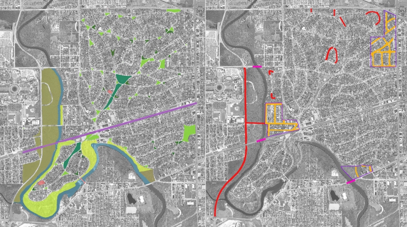 Riverside contributing landscape features array throughout the neighborhood, while street patterns and bridges on the right depart from the historic plan