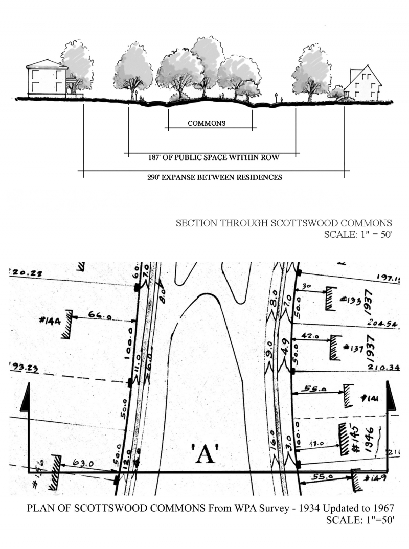 Sections through the Riverside Village demonstrate the pervasive presence of common landscapes and setbacks of house yards at varying scales