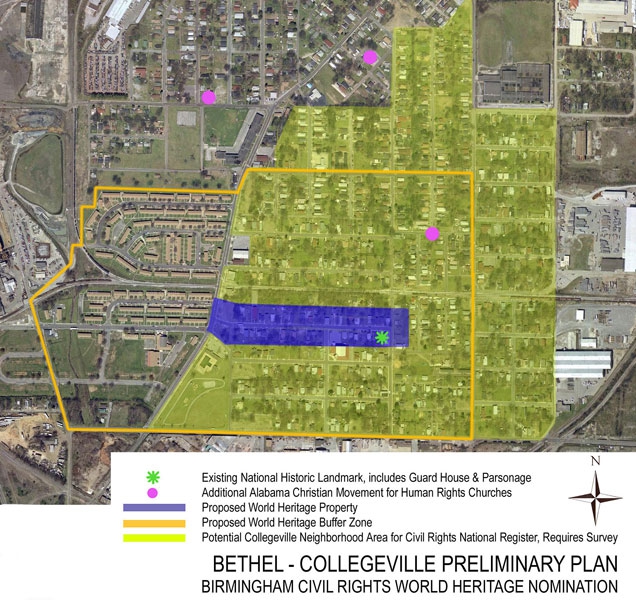 The 16th Street Baptist Church, Bethel Baptist Church, in Birmingham, AL, are focus points of the 1950s to 1960s non-violent African American struggle for human rights. The churches and surrounding neighborhoods were centers of the faith-based, non-violent, direct, action movement that enabled the federal actions to overcome segregation seeking to ensure the rights of citizenship to African Americans. Placed on the US World Heritage Tentative List in 2007, two Birmingham churches focused the local actions. Heritage Landscapes consulted with the Birmingham Historical Society (BHS), preparers of the WH Tentative List nomination, in 2009 to study documents and sites that captured the Birmingham Civil Rights actions toward an enlarged nomination to the World Heritage (WH) List. Heritage Landscapes work: