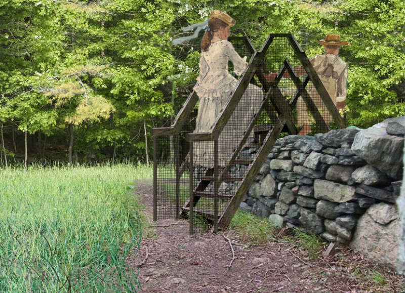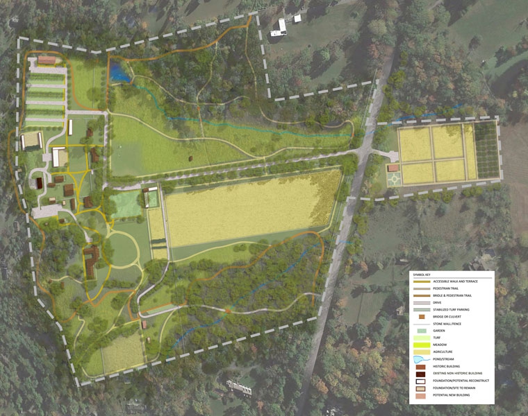 Opportunities for the rehabilitation and reconstruction of historic buildings and potential construction of new buildings to serve educational, interpretive and staff uses within the historic organization are identified. The plan proposes a new parking lot, with green infrastructure for stormwater management sited near the site of the historic orchard and interplanted with apple trees. Phased restoration of prominent stone walls and placement of wooden stiles at locations where paths intersect stone walls, introduces visitors to this historic technique and facilitates movement around the property on a more complete system of paths and trails. Progress is underway.