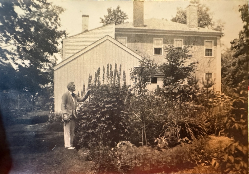 Fairy garden extends east from the Carriage House with Burt Hosmer admiring delphinium.