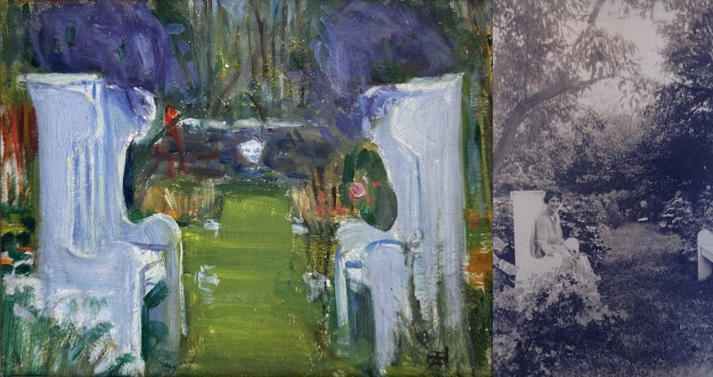 Florence Hosmer garden painting paired with woman sitting in garden analyzed to develop landscape plan with reconstructed garden.