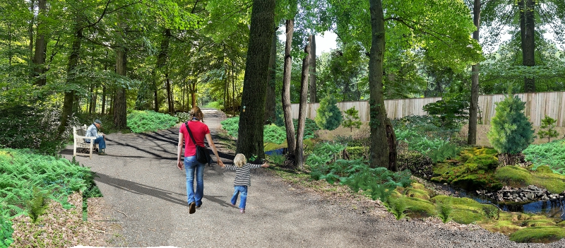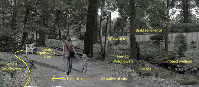 Simulated view with new plantings, a restored and protected wetland, a new gathering area with bench seating, and a proposed solid fence to limit visual and auditory incursion.