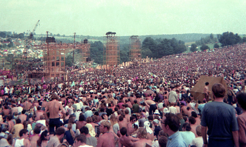 View of crowd, stage, sound towers and campsite at the 1969 Woodstock Festival.