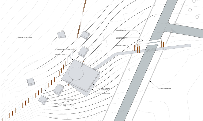 Study for interpretation of the stage, fence, sound towers and performer bridge features.