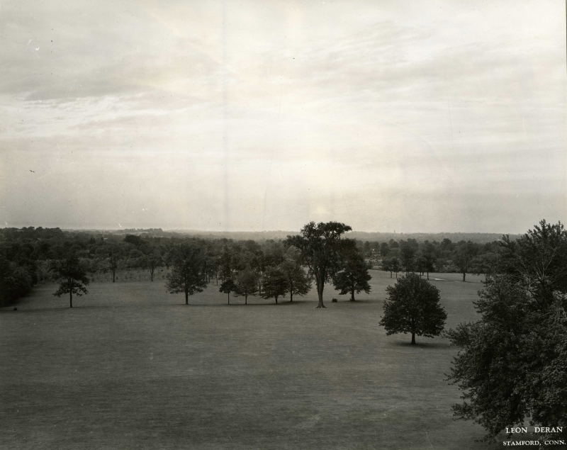 Circa 1936 south-facing view from Waveny House over open fields and under tree canopy to the newly planted southern property boundary along the Merritt Parkway. Courtesy FLONHS.